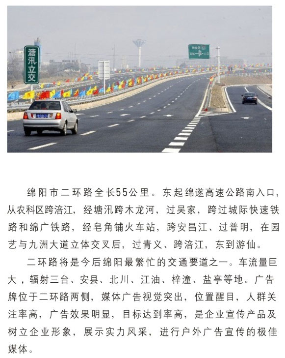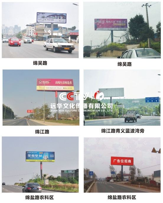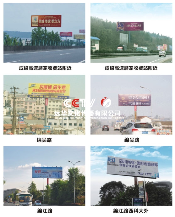 公司擁有單立柱及戶外大牌100余個,分布在成綿高速磨家收費站、綿鹽路、綿三路、綿江路、綿梓路、綿陽農(nóng)科區(qū)、綿安路、科學城、二環(huán)路等??蓱蛻粜枨蠼?、審批、發(fā)布戶外單立柱廣告牌。